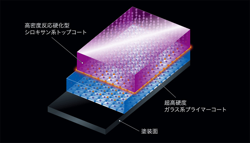 新開発の「⾼密度反応硬化型シロキサン系トップコート」を、強⼒な架橋作⽤によって⾼いバリア性能を発揮するモースコードレベル8の「超⾼硬度ガラス系プライマーコート」に強固に反応硬化させることに成功。これにより⾮常に強靭な被膜構造を形成、施⼯初期の撥⽔性能をはじめ防汚性・耐候性・洗浄耐久性・耐スクラッチ性を